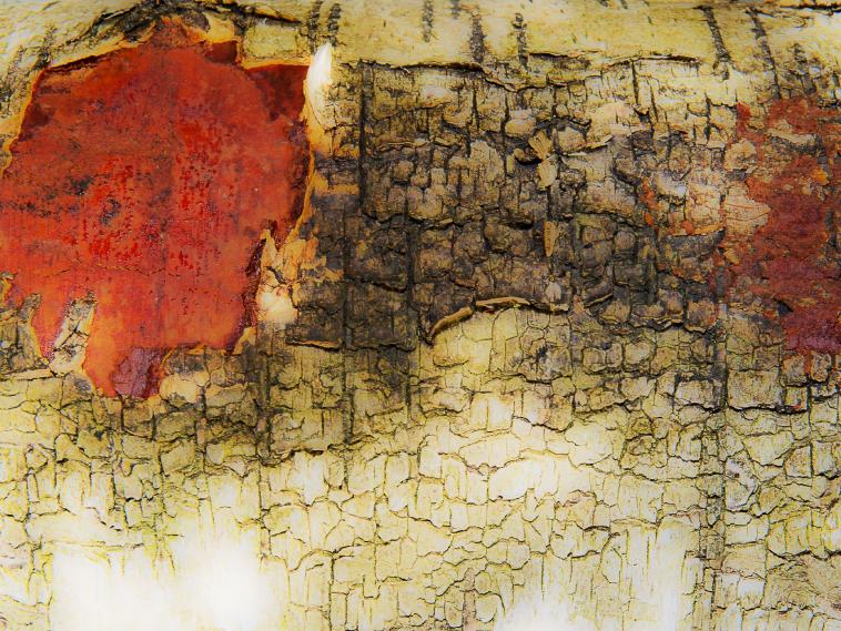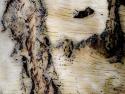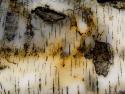 Verwelktes Blatt auf einem Birkenstamm